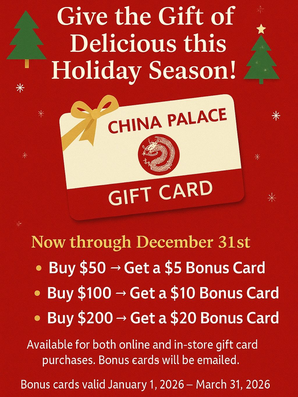 A China Palace gift card is the perfect present for food lovers! Whether it's a cozy night in, a family celebration, or a well-deserved treat, our gift cards make every occasion delicious. Easy to purchase, easy to redeem, and always appreciated!